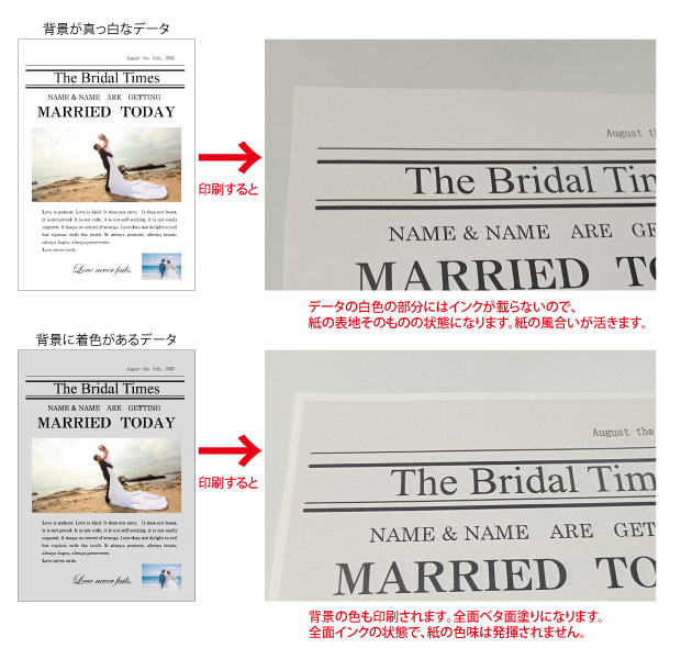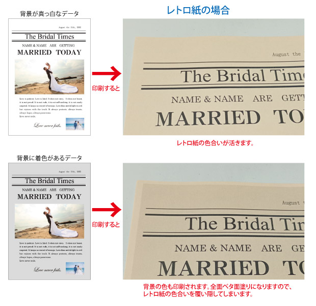 | 印刷方式はオンデマンド印刷です。オンデマンド印刷という印刷方式は、白色は紙の色を使うため、白のインクは使いません。このためレトロ紙やクラフト紙などは真っ白な発色はできません。また、ラメ入りインクの使用もできません。 |