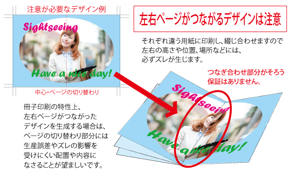 印刷工程は誤差があり、1mm以内が許容範囲になります。紙を縁取るような枠や1mm以内を狙うようなデータなどは、若干の仕上がり誤差がある旨を想定して作成ください。 |